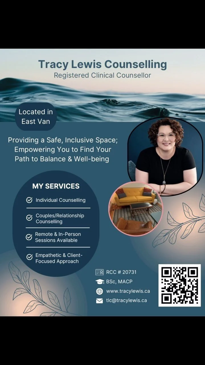 Online sessions are offered on a secure video platform called Jane. In-person sessions are offered in a private counselling office located in East Vancouver.